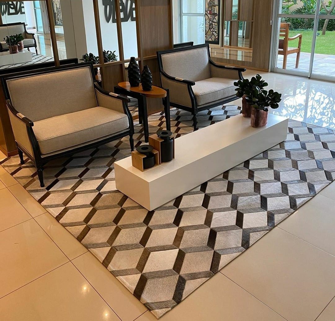 Os Tapetes de couro são feitos a partir de peças selecionadas de couro bovino nobre , oferecendo um padrão de quadriculado único. Confeccionados com costura em zig-zag, garantindo qualidade e resistência em cada acabamento. Os tapetes são confeccionados com todo cuidado, desde o corte das peças até a colocação do forro especial inteiro no tapete. Os tapetes de couro são excepcionalmente duráveis e fáceis de manter, combinação com ambientes rústicos ou modernos. Todos couros são curtidos de forma sustentável, visando assim , baixo impactos ambiental e sustentabilidade.
